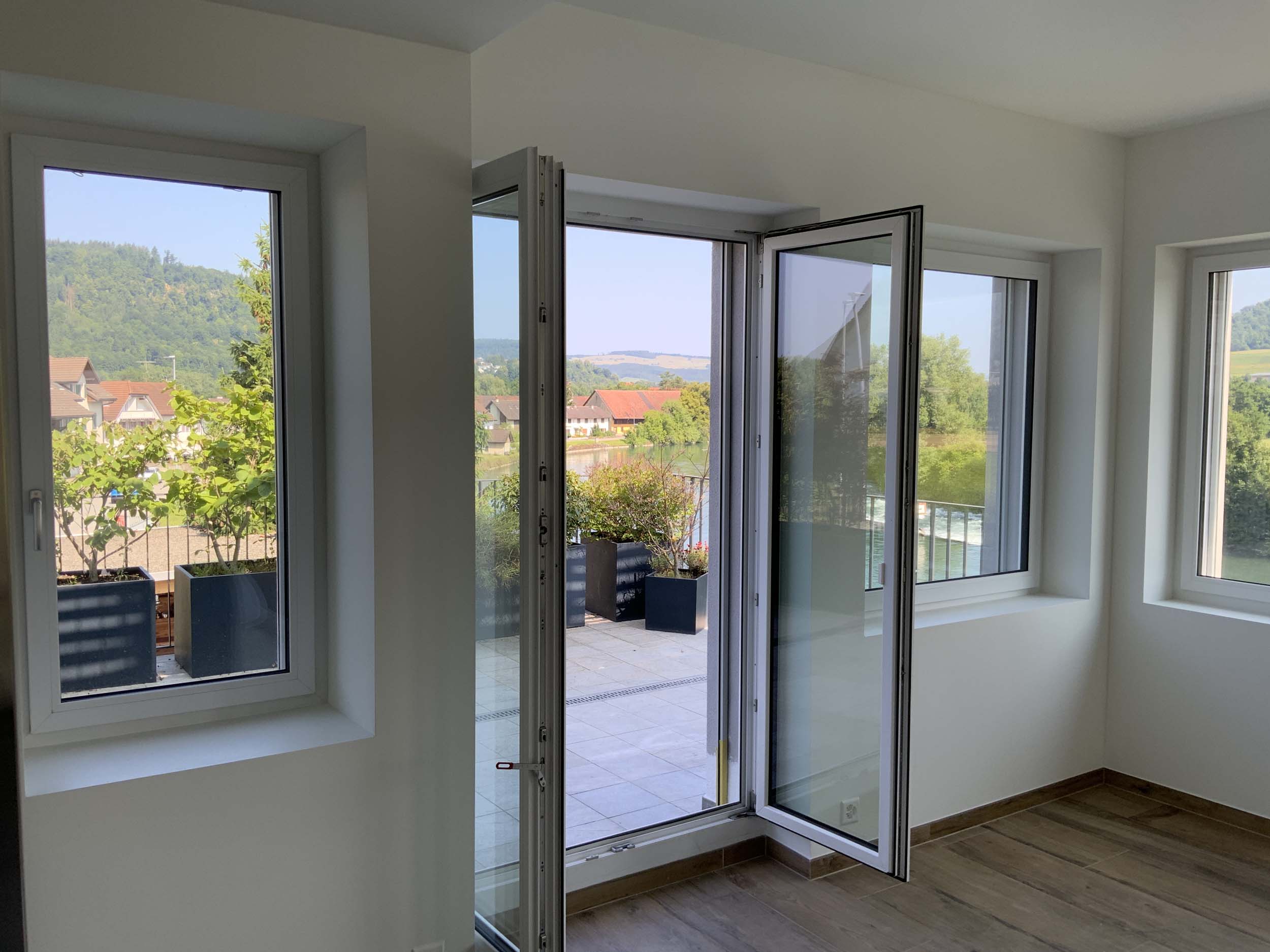 - Helle Räume mit vielen Fenstern und elektrischen Rafflamellen-Storen