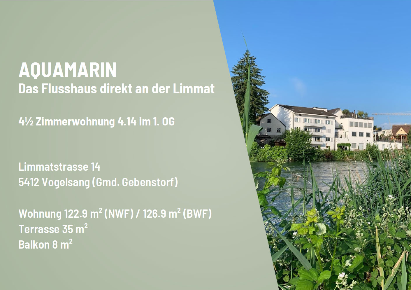 An Ihrem neuen Wohnort liegt alles Wünschenswerte direkt vor Ihrer Wohnungstüre: die unberührte, geschützte Auenlandschaft rund um Vogelsang als Naherholungsgebiet und direkt an Ihr Grundstück grenzend die ruhig dahinfliessende Limmat. Eine Lage, wie geschaffen, um die Seele baumeln zu lassen.