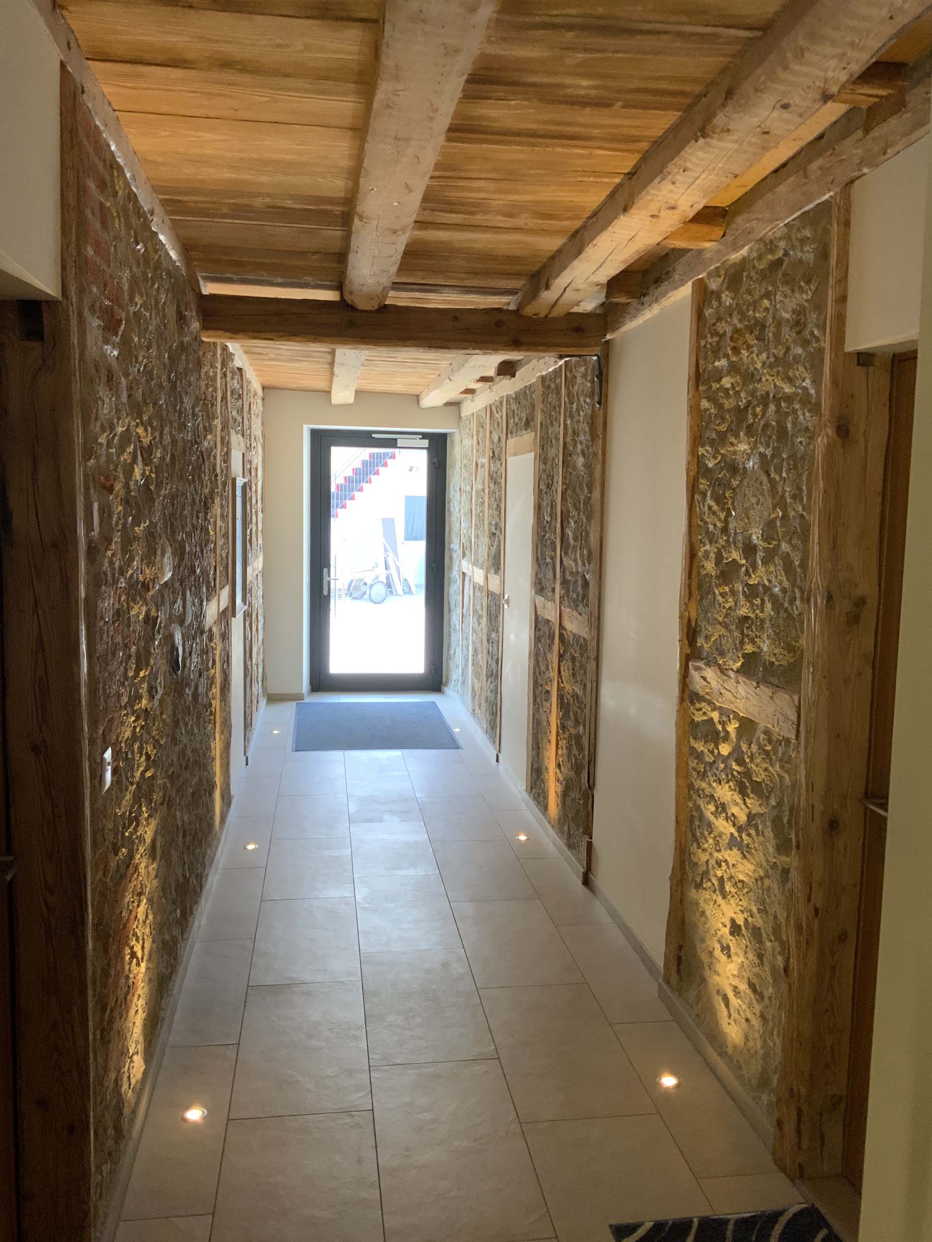 Historische, über 3 Meter hohe Gewölbe aus altem Bruchstein-Gemäuer wurden Bestandteil des Hauses und der 6 Wohnungen mit Fussbodenheizung und allem erdenklichen Komfort. Bereits im Eingangsbereich zum Flusshaus werden die Bewohner und die Gäste durch das ursprüngliche Bruchstein-Mauerwerk und die 150 Jahre alte Balkendecke auf die aussergewöhnlichen Wohnungen eingestimmt.