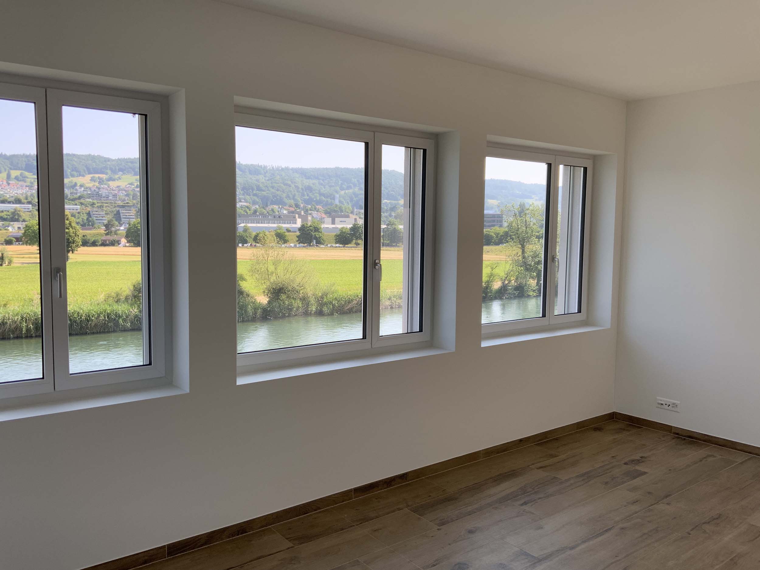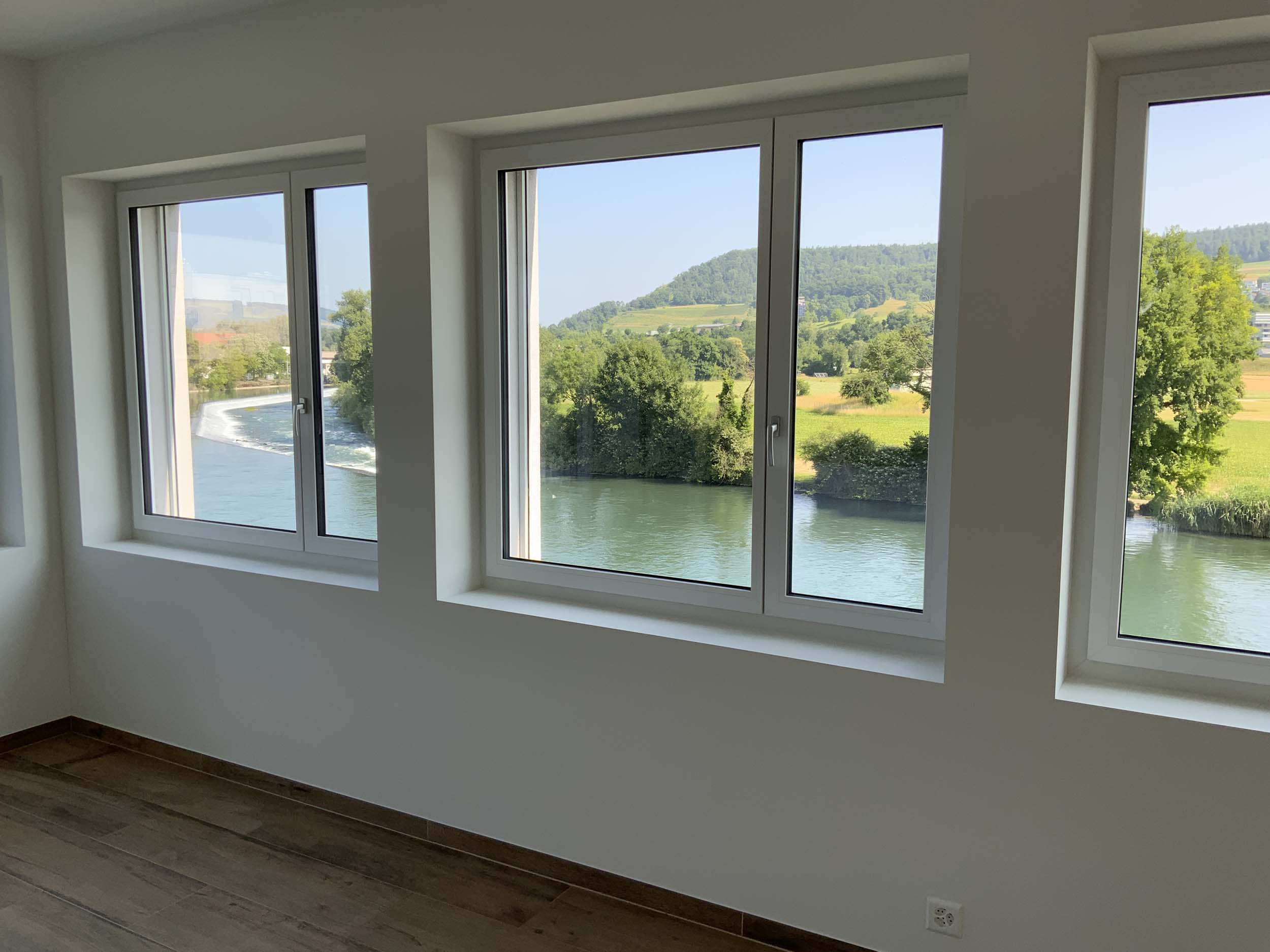 - Helle Räume mit vielen Fenstern und elektrischen Rafflamellen-Storen